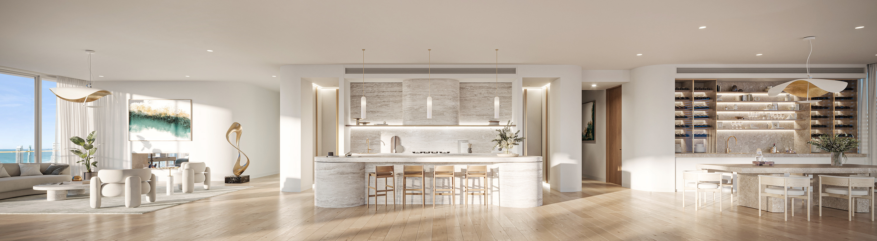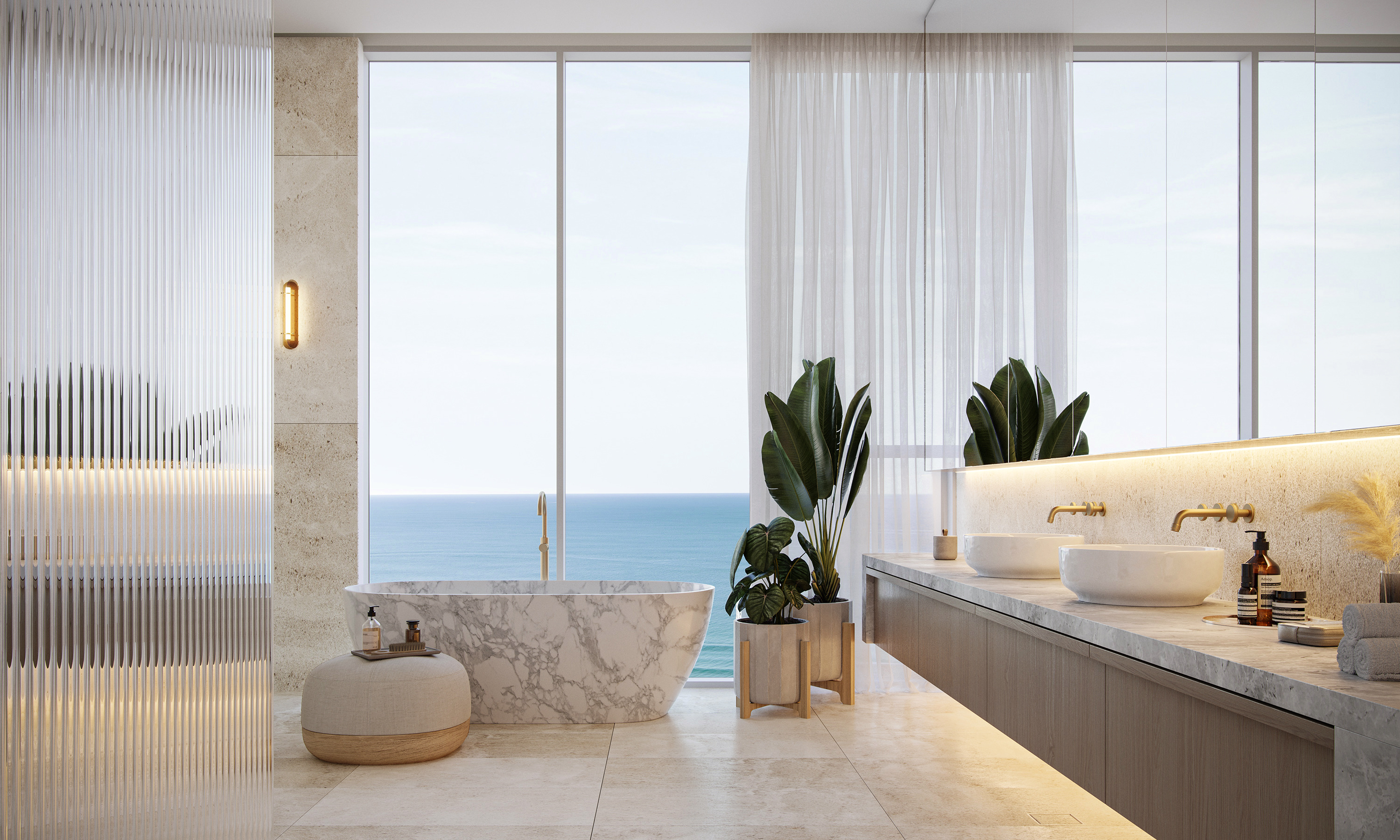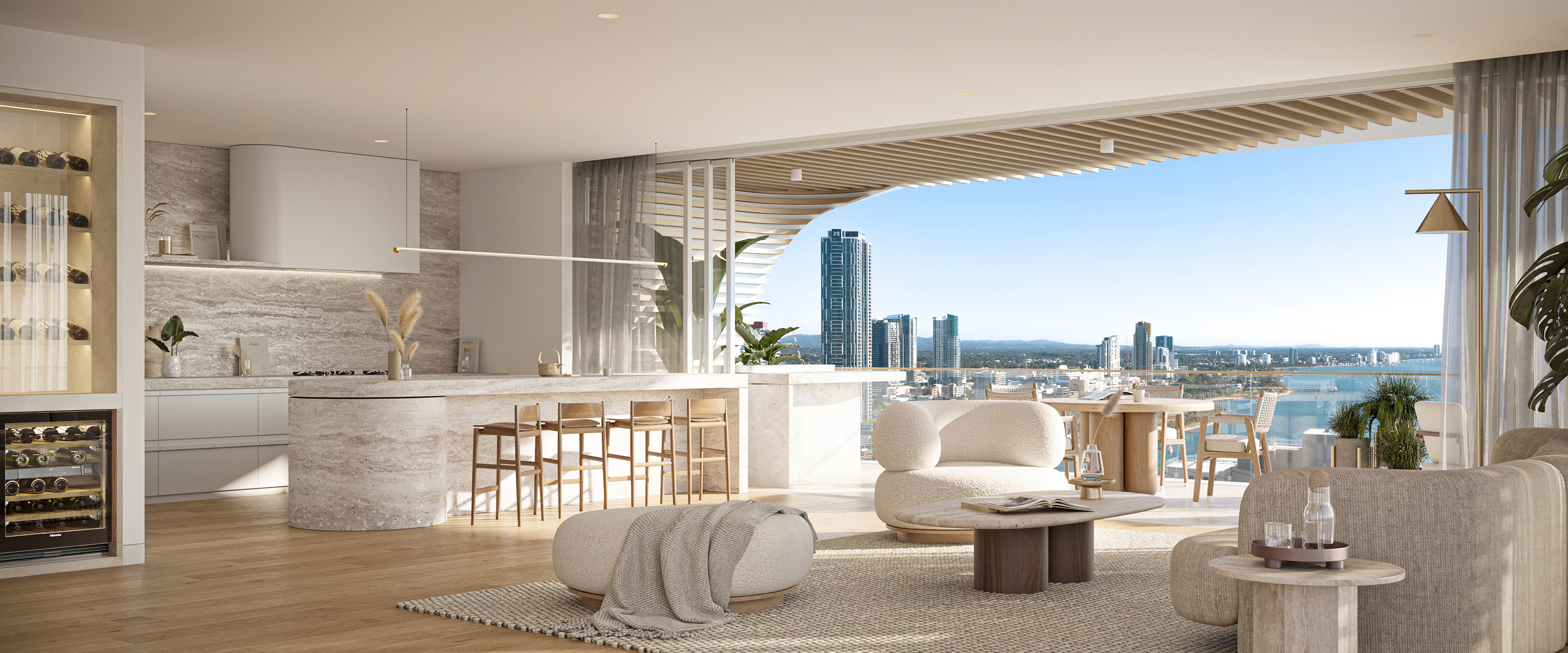 Delivering on such a vision meant crafting each residence to the finest detail. No expense was spared – with each apartment offering 360-degree views from Surfers Paradise to the Spit, and across the Broadwater and out to sea. This was achieved partly through expansive glass façades that promote the seaside vantages, while curated natural materials and bespoke joinery also serve to pull the outside in.