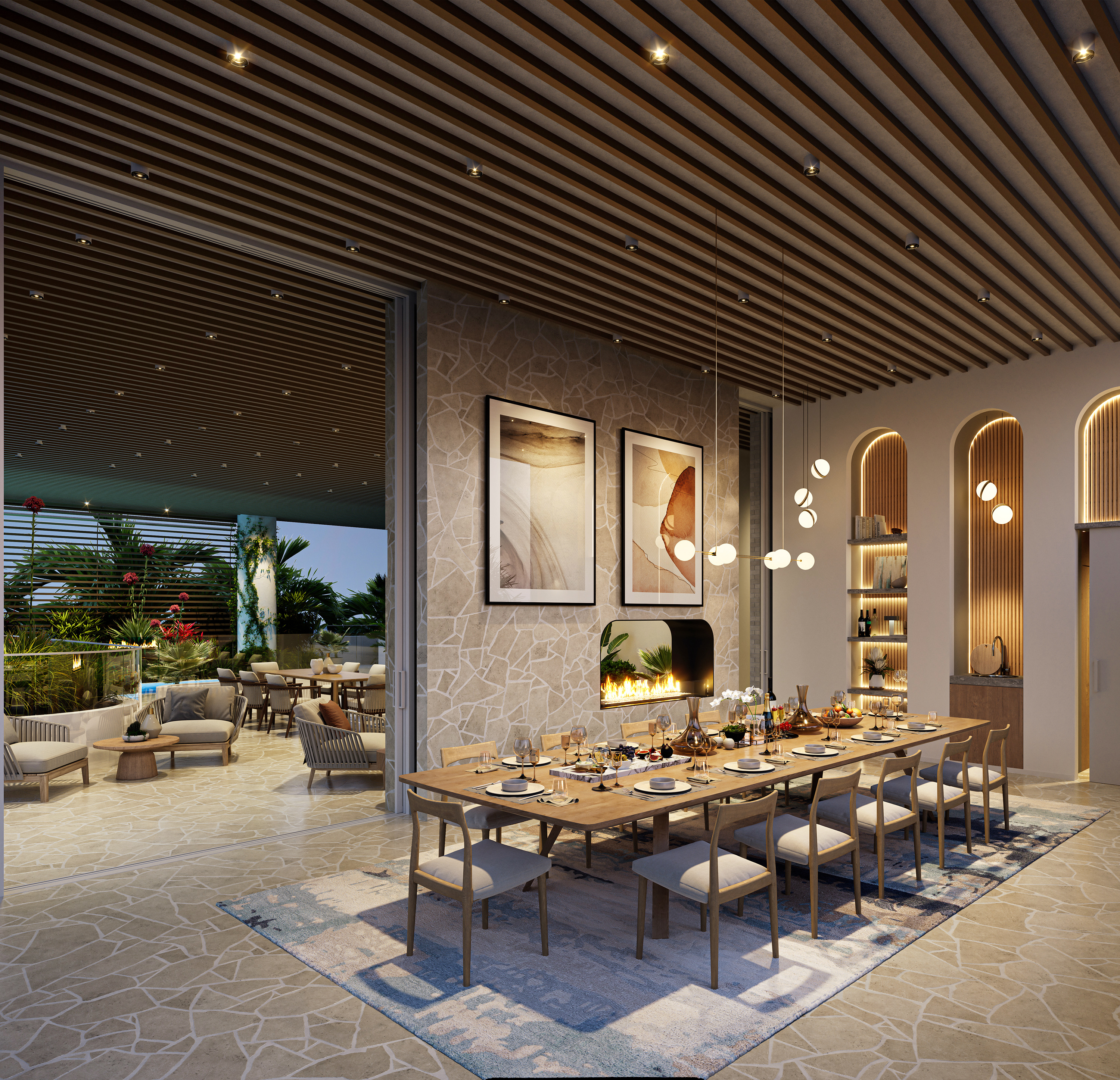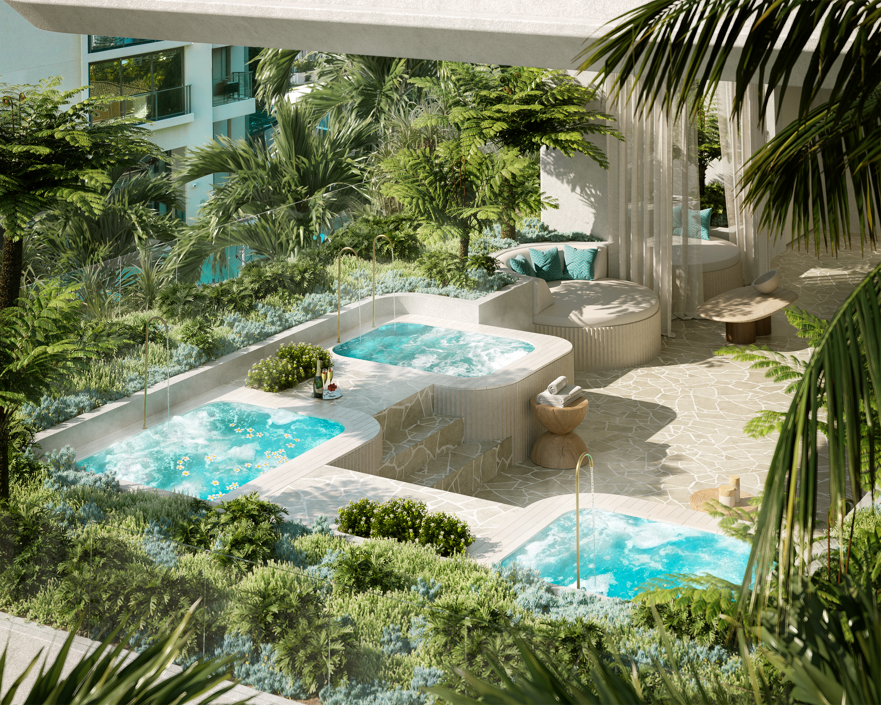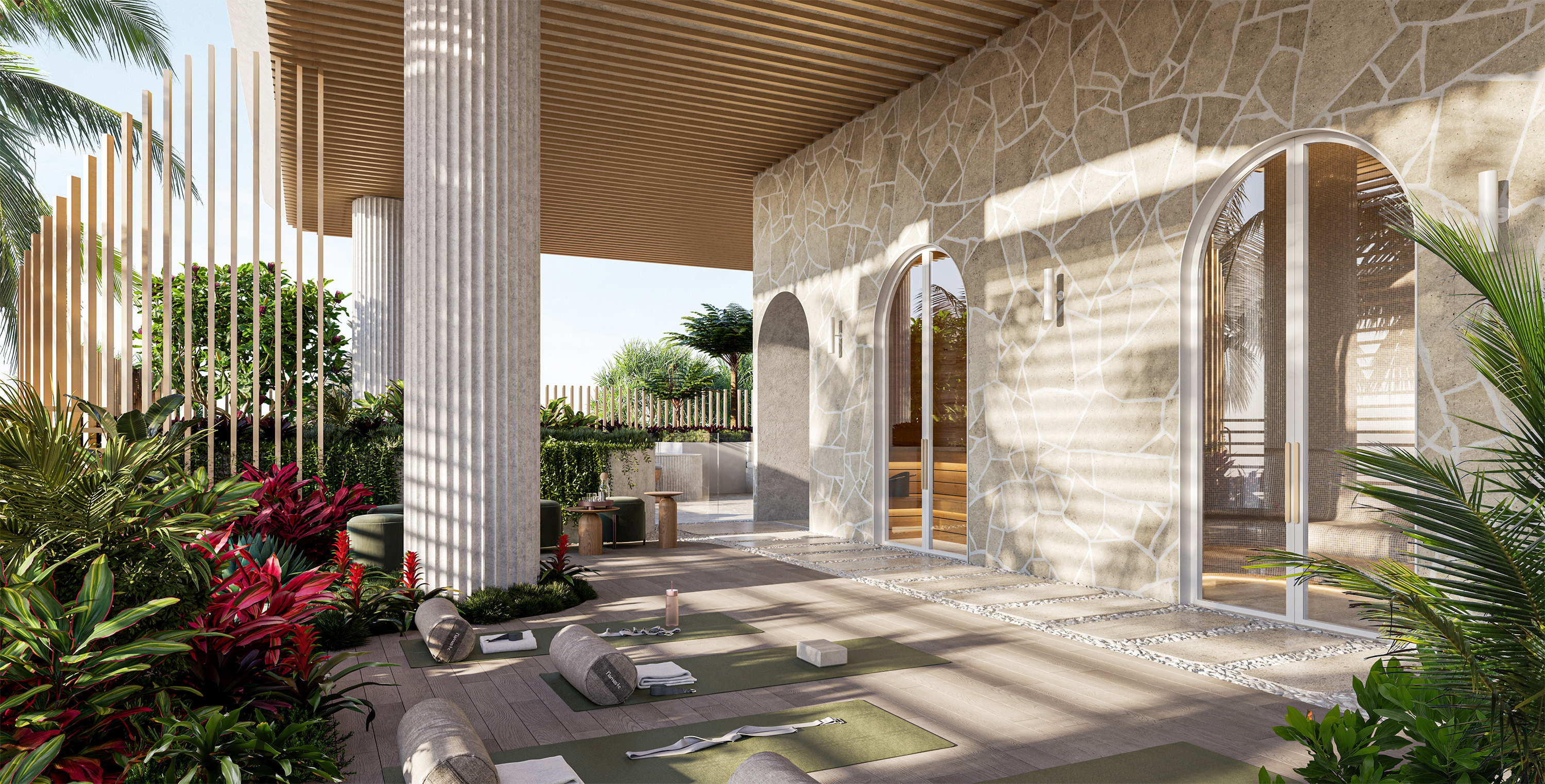 Resort-like vibes abound throughout the building, from a private oasis day spa to rooftop swimming pool and landscaped nooks from which to take in the last of the golden light.