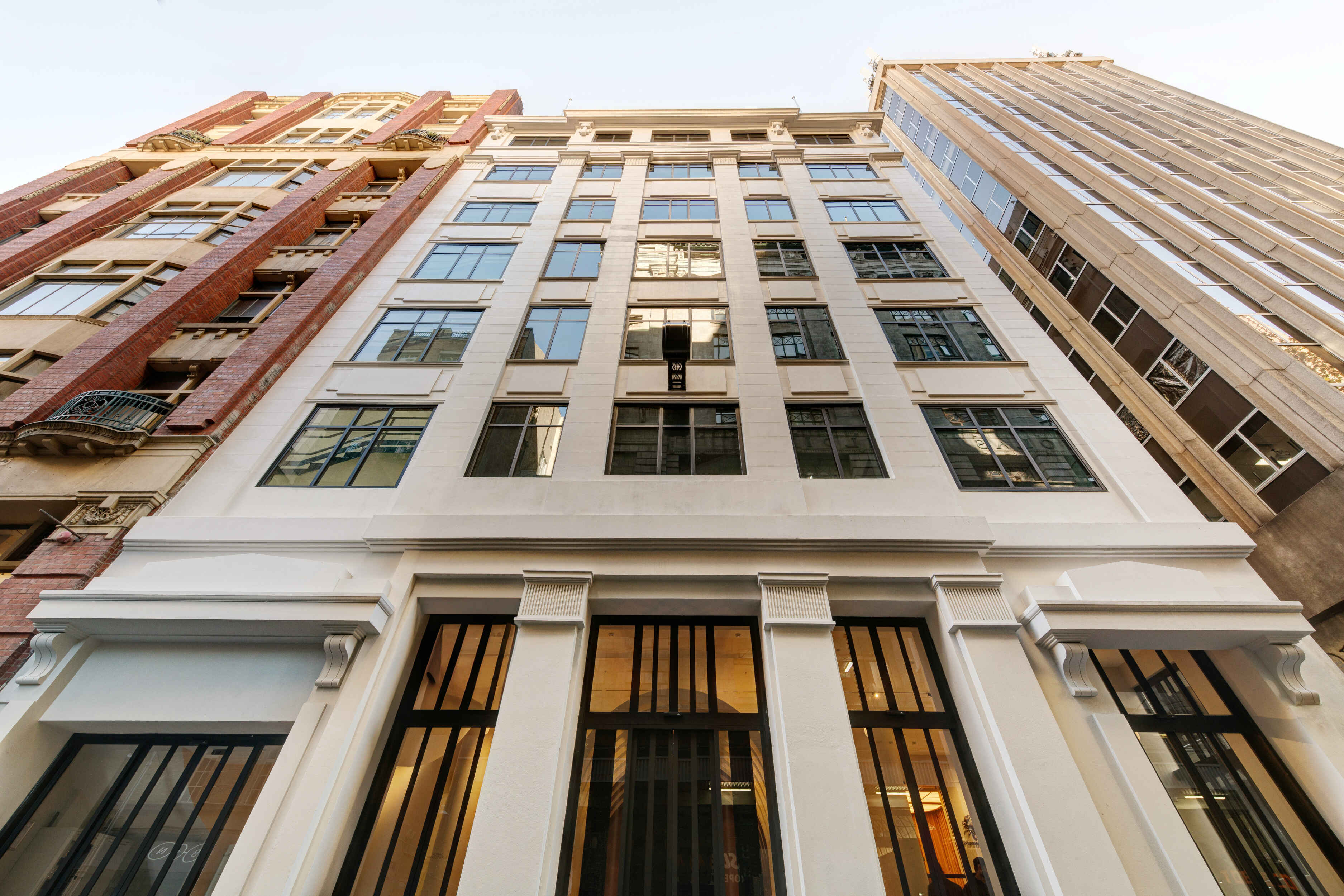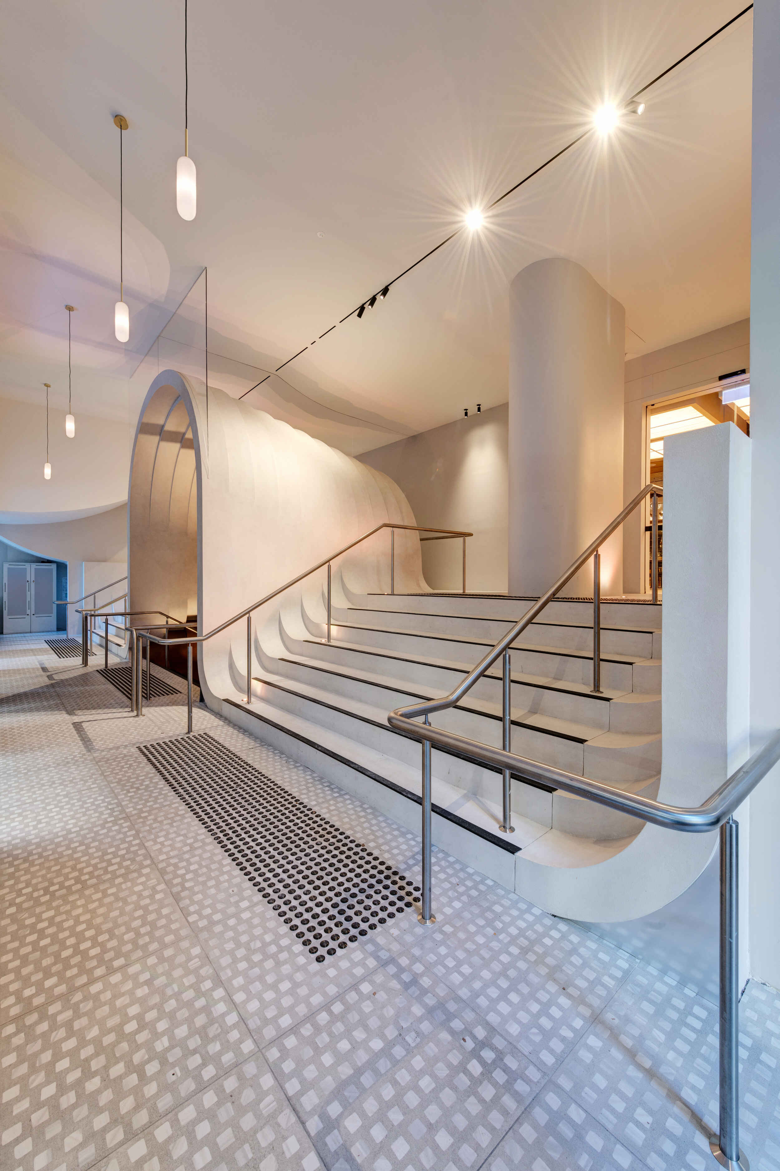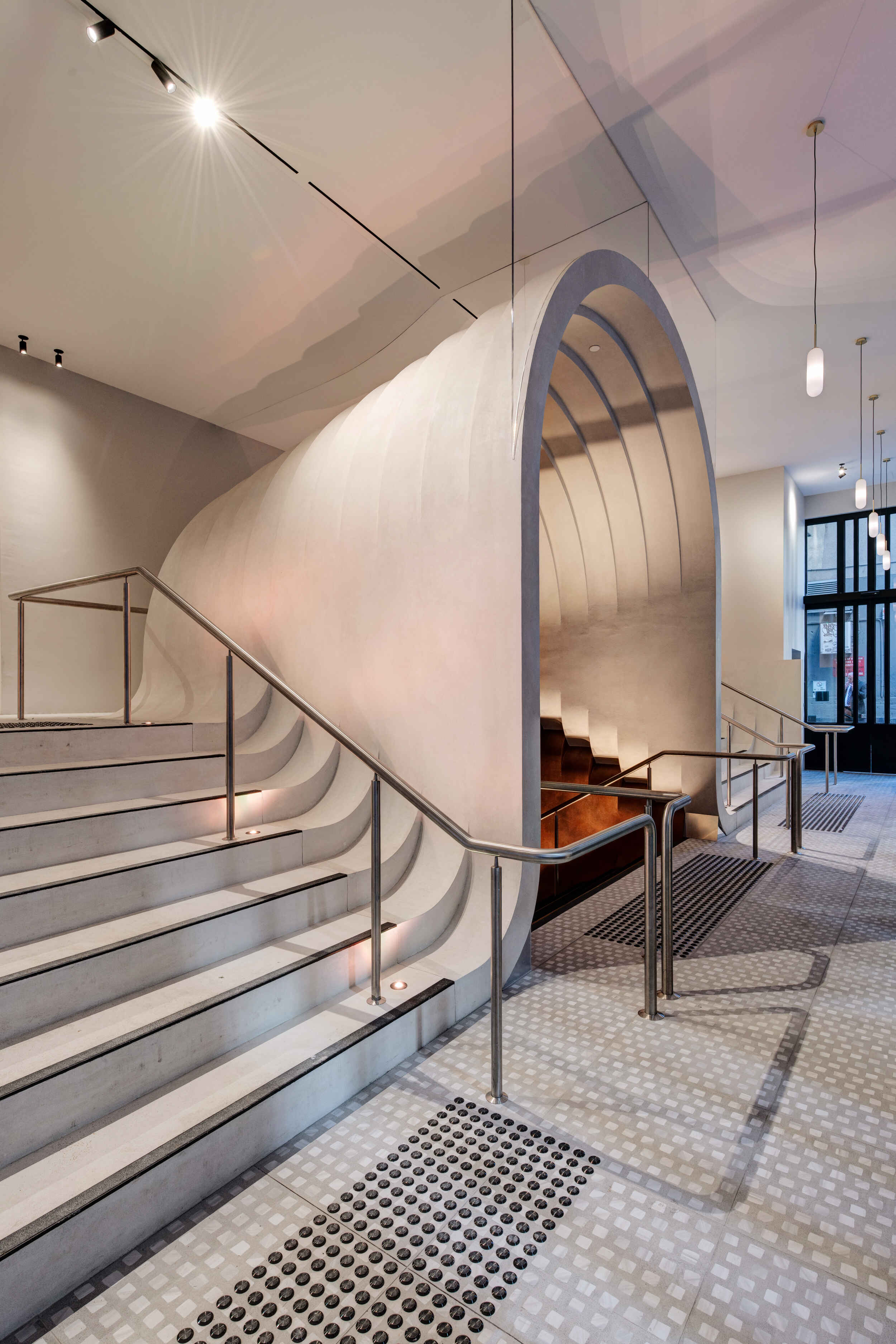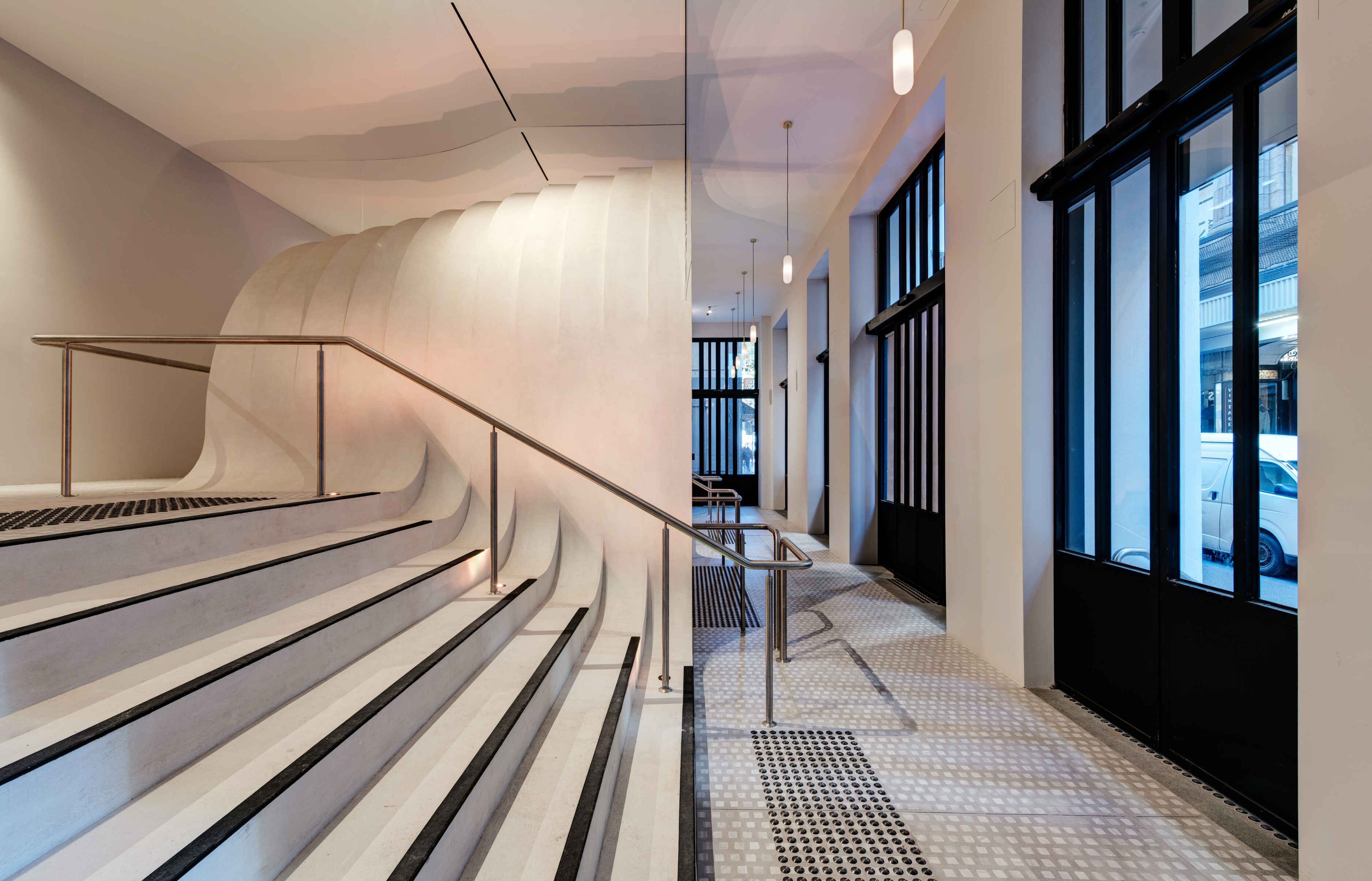 The carefully sculpted staircase is equal parts functional and aesthetic, connecting all levels simultaneously. Visually inspired by the building’s silk trade history, it entices visitors in from the street with its rhythmic arched opening. That same central arch is also in conversation the glazed arcade of the Nicholas Building opposite. It’s a distinctive addition to the public laneway realm.