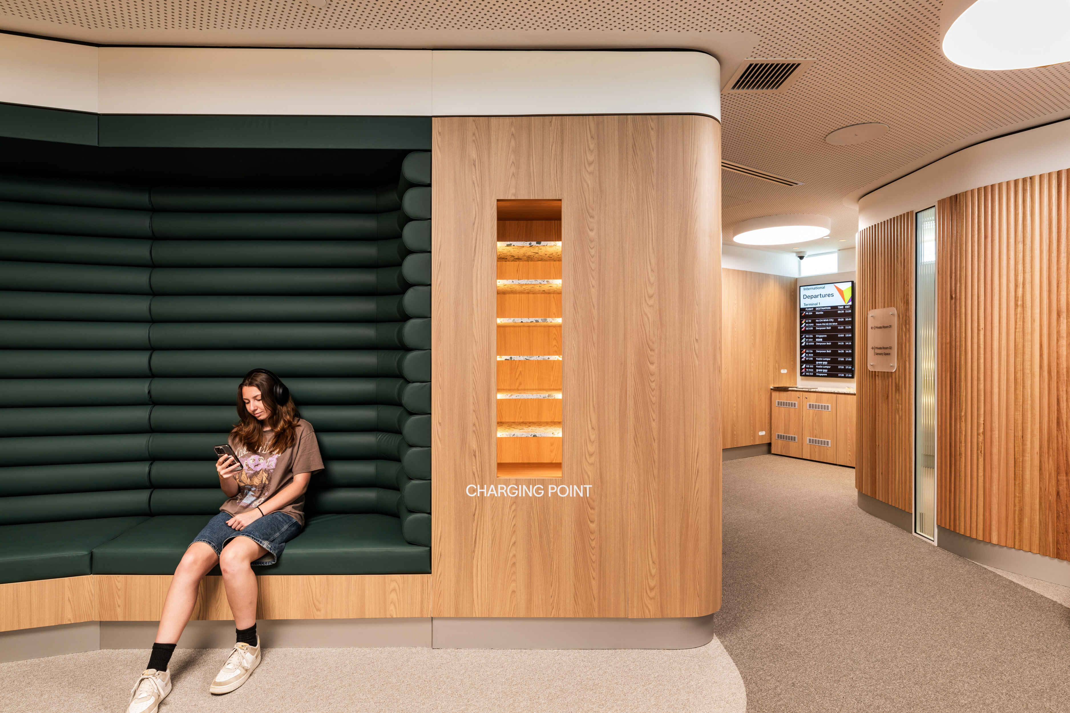 Finely crafted down to the last detail, soft furnishings, tactile finishes and natural materials provide a clear departure from the slick, high-traffic surrounds of the terminal. Colour treatments were designed to be soothing yet not overstimulating, and the inclusion of sensory-seeking accessories ensures the space supports a broad spectrum of users across all age groups.