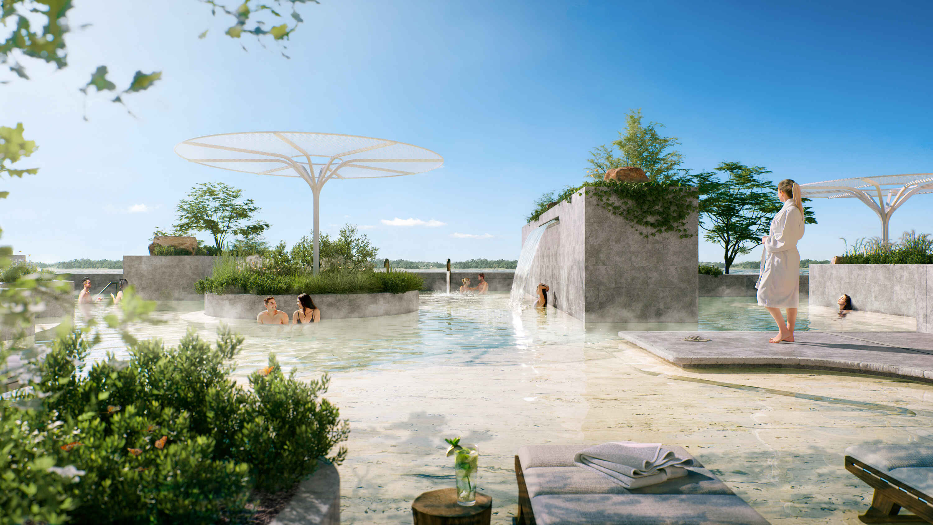 The proposed experience is layered and immersive. Over 25 thermal bathing experiences, saunas, hammams, and Vichy showers are integrated into the site. A rooftop bar, day spa, restaurant and café offer moments to pause and take in the Swan River’s shifting light. Together, the precinct is designed to welcome up to 500 guests daily.